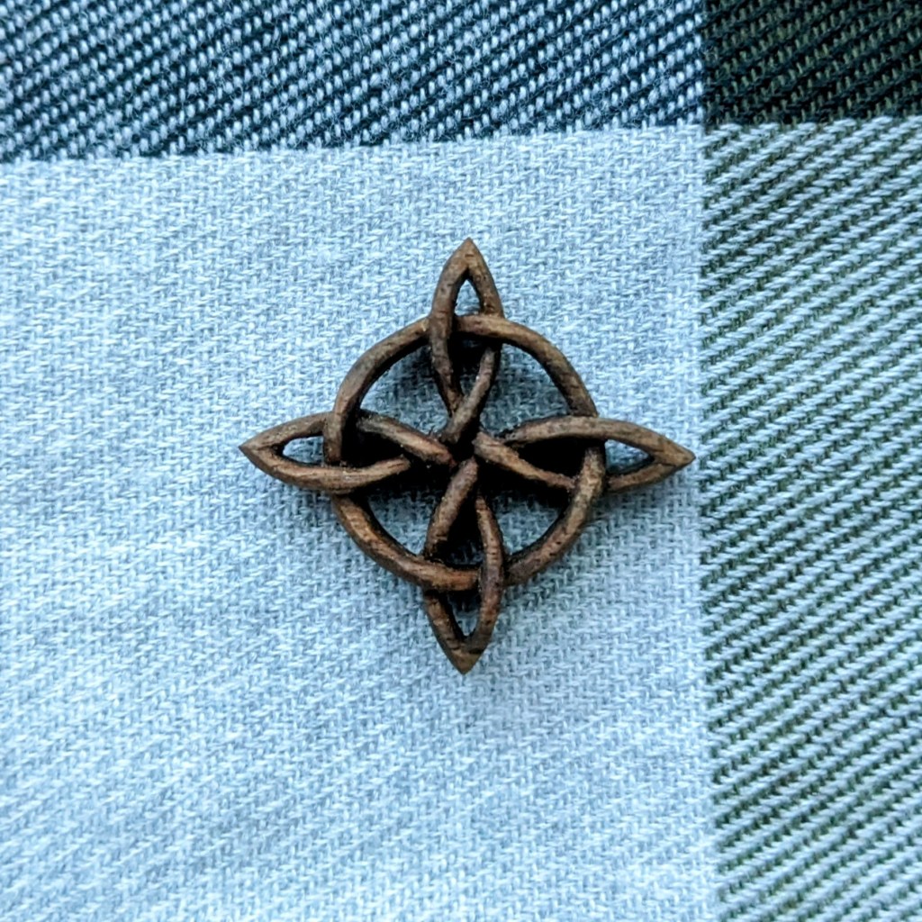 The compass rose knot comes in two sizes: small (1 1⁄8″ dia.) and large (1 3⁄8″ dia.). You can also order it as either a necklace with an 18″ leather cord or as a pocket charm without the cord.